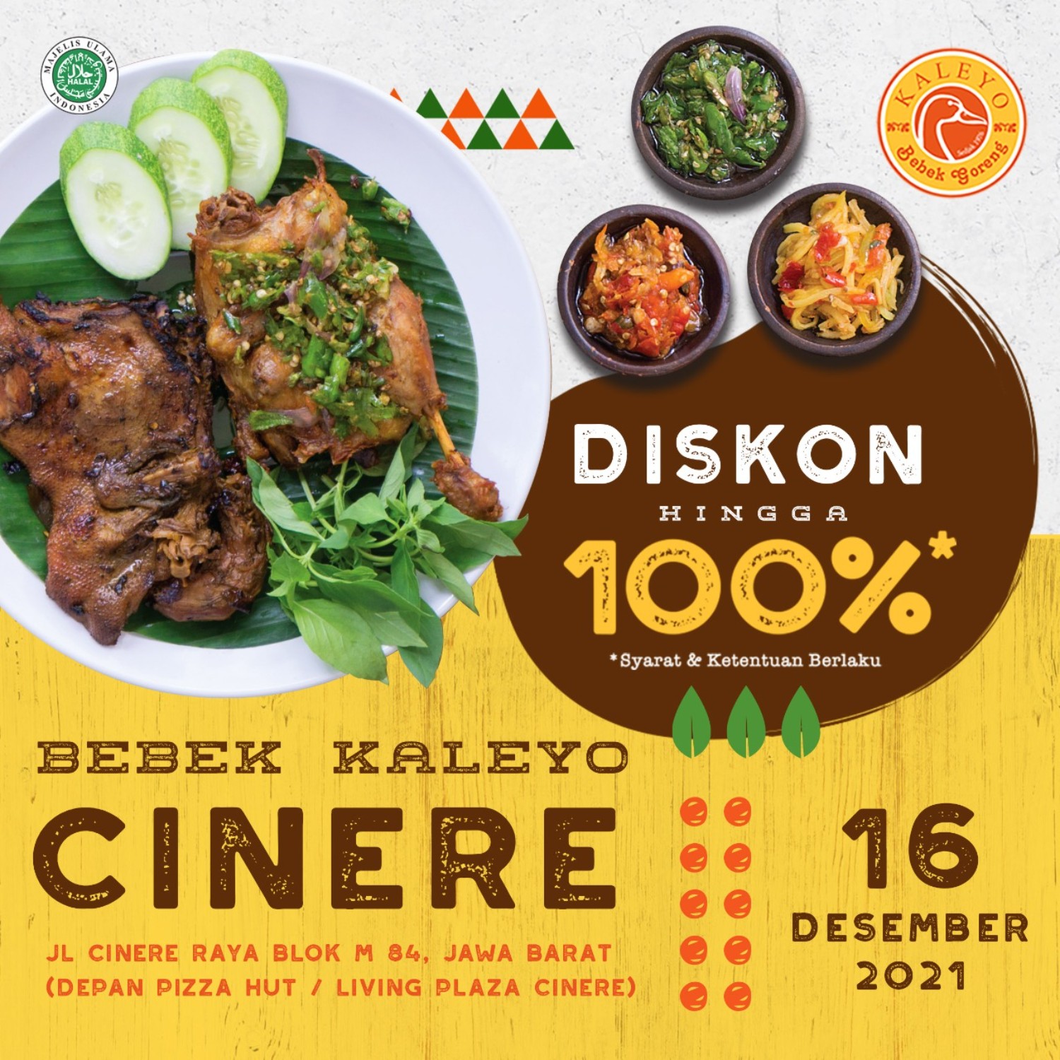 Sebentar lagi Bebek Kaleyo akan hadir di daerah CINERE nih guys. mulai tanggal 16 Desember 2021 kamu sudah bisa menikmati Bebek Enak Empuk Lezat dengan Sambal Dahsyat khas Bebek Kaleyo. . Khusus tanggal 16 Desember 2021 akan ada diskon sd 100% nih guys, syaratnya kamu cukup datang dan makan di tempat. Buruan catat tanggal nya dan temukan lokasinya, see you soon ???? !
