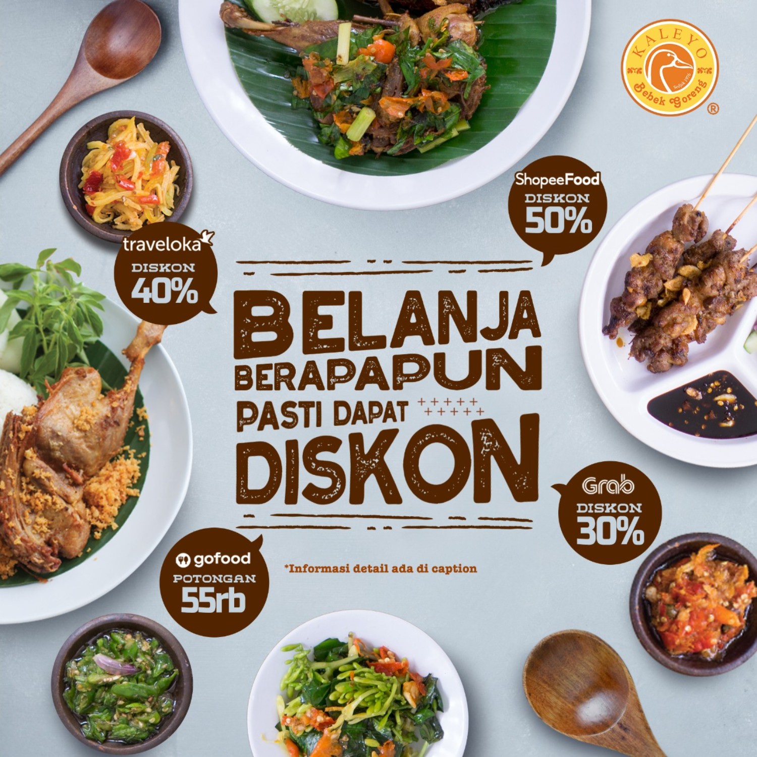 Gokil ! ga perlu nunggu sampai akhir bulan, Bebek Kaleyo kasih diskon untuk kaleyo lovers yang suka pesan di platform online seperti @grabfood, @gofood, @shopeefood dan @travelokaeats. . 1. Belanja 35 ribu, grabfood (diskon 15 ribu) 2. Belanja 40 ribu, shopeefood disc 50% 3. Belanja 50 ribu, travelokaeats disc 40% 4. Belanja 80ribu, grabfood disc 30% 5. Belanja 150ribu, gofood (pot 55ribu) . Ingat diskon bisa tiba" hilang , buruan pesan sekarang juga !