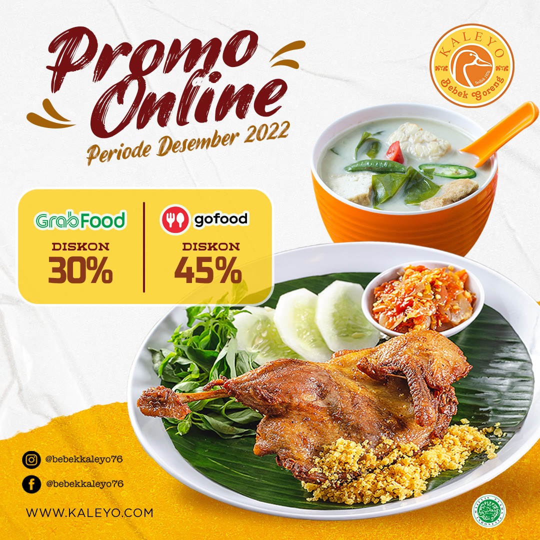 Hai Kaleyo Lovers ! Akhir tahun penuh ceria datang dengan promo online yang bisa bikin kamu hemat dan kenyang. Pesan lewat Grabfood diskon 30% dan Go food diskon 45%. Buruan pesan Bebek Kaleyo sekarang juga dan nikmati promo menariknya di aplikasi online kesayangan kamu !