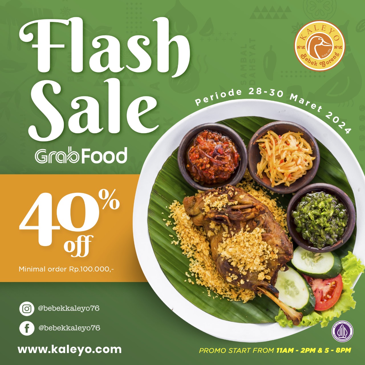 Kaleyo Lovers mana suaranya? Khusus buat kamu yang pesan makanan Bebek Kaleyo di GrabFood, nikmati diskon Flash Sale 40% dengan potongan harga hingga 50rb. Caranya cukup lakukan pembelian Bebek Kaleyo min.100rb di Grabfood, di tanggal 28-30 Maret 2024. Ingat, promo ini berlaku mulai pukul 12.00 -16.00 WIB Jangan sampai kelewatan, ya!