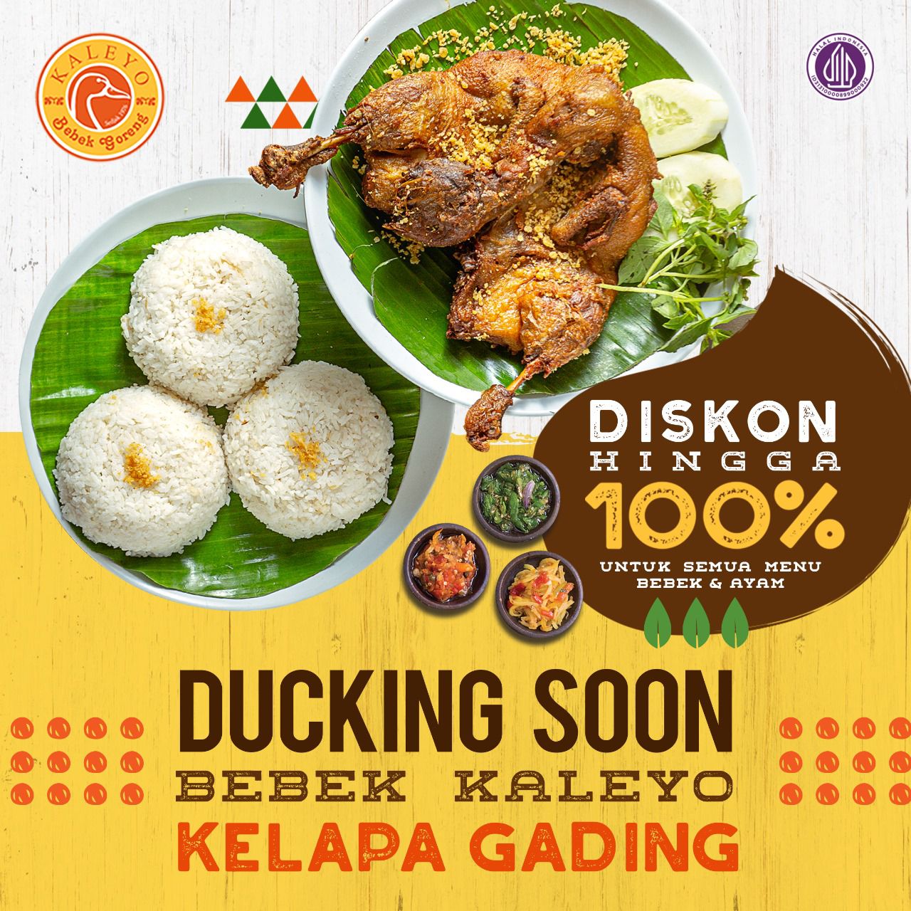 Hai, warga Kelapa Gading Kami punya kabar gembira buat kamu! Bebek Kaleyo bakal hadir di Kelapa Gading bulan Desember 2024! Siap-siap untuk Grand Opening yang penuh kejutan, termasuk diskon spesial hingga 100% untuk menu bebek dan ayam! Nantikan tanggalnya, dan jadilah bagian dari momen seru ini!
