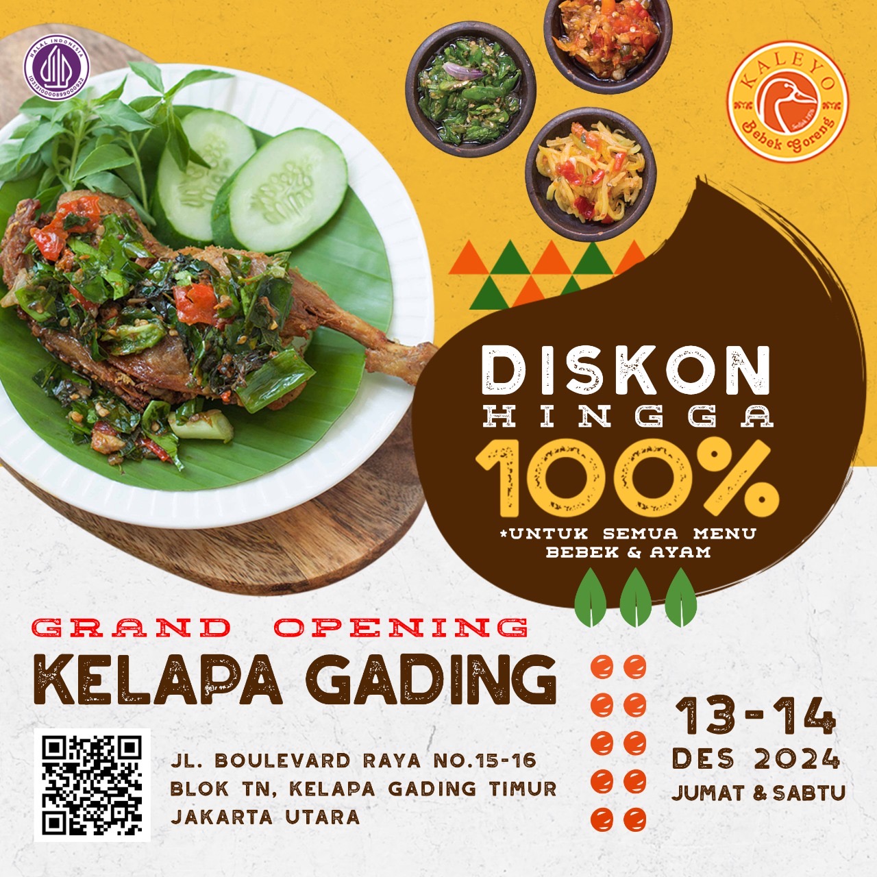 Siap- siap grand opening Kaleyo Kelapa Gading 13-14 Desember 2024 Catat Syaratnya ya! 1. Promo ini khusus di tanggal 13-14 Desember 2024 2. Berlaku untuk Dine-in (makan di tempat) dan menu yang terdiskon adalah semua menu bebek & ayam. Kecuali paket hemat, paket bertiga, & paket charity. 3. Semua pasti mendapat disc. s/d 100% dengan cara mereview medsos Bebek Kaleyo. Ayo...serbu!!!