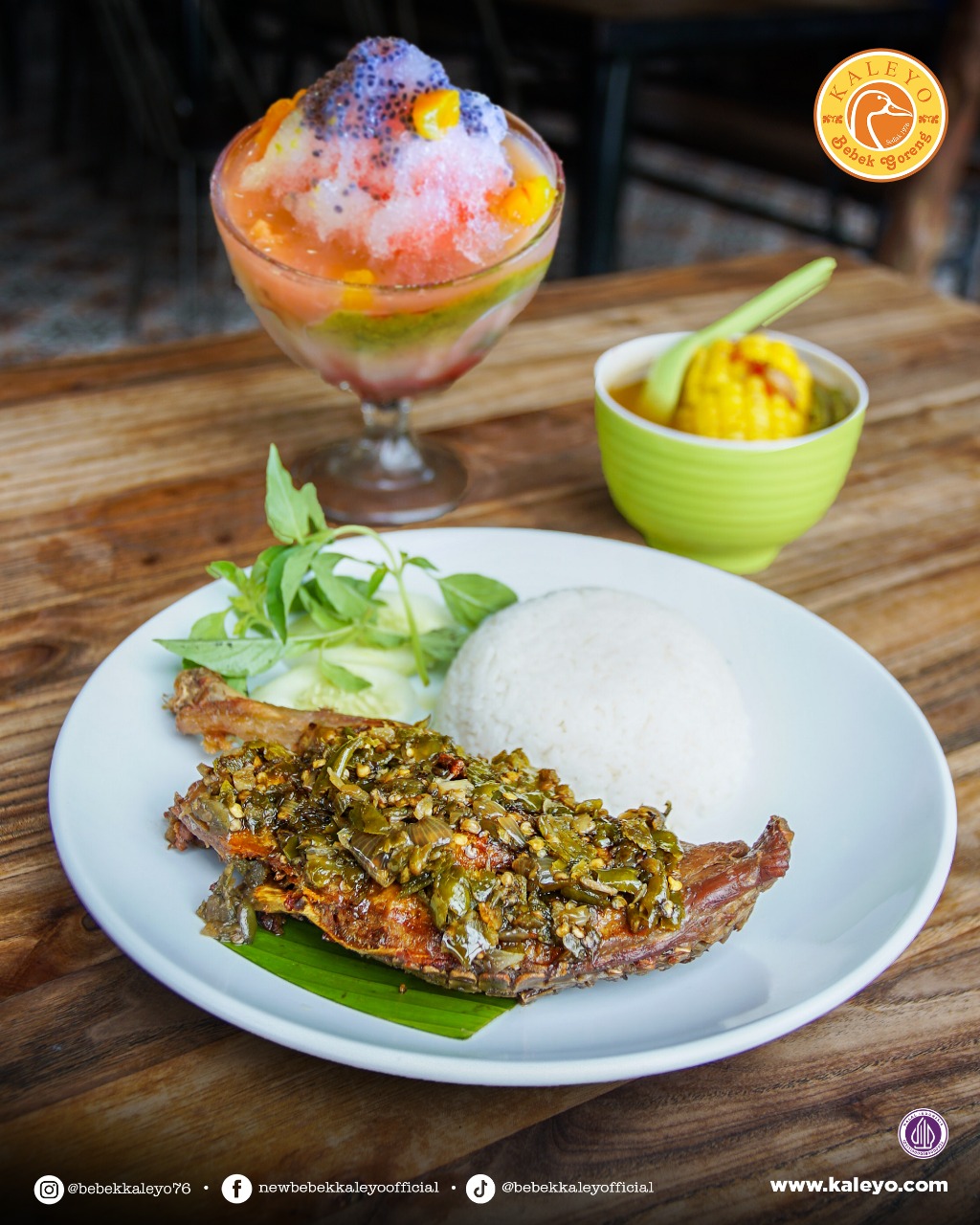 Siang-siang enaknya yang begini? Bebek Muda Cabe Ijo – Pedasnya bikin nagih Es Campur– Segarnya nyussss di tenggorokan Sayur Asem– Gurih, asam, seger, mantap buat pelengkap Udah kebayang kan nikmatnya? Yuk, langsung mampir ke Kaleyo