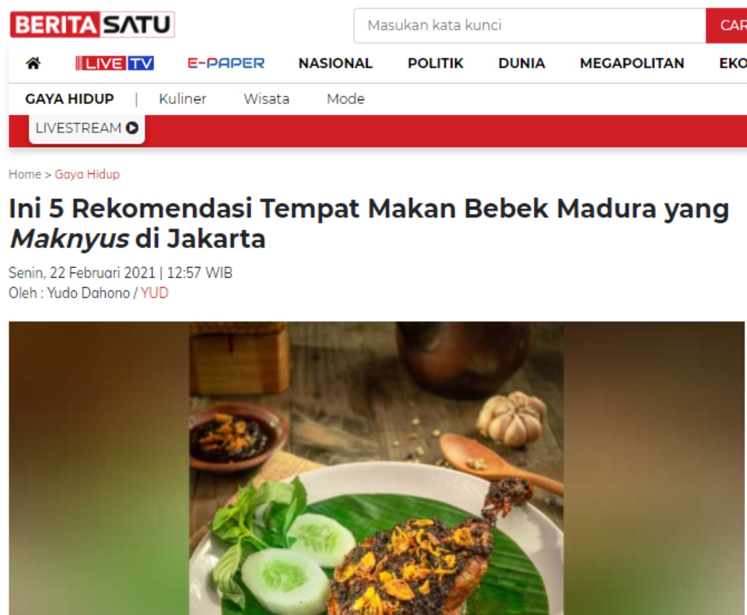 Jakarta, Beritasatu.com - Pada masa pandemi Covid-19 seperti sekarang ini, kebutuhan masyarakat akan makanan yang higienis dan juga sehat amat penting. Salah satu pilihannya adalah sajian berbahan baku bebek. Berikut ini salah satu tempat makan yang menghadirkan menu bebek dan rasa dan sajian istimewa yang menggugah selera makan Anda. Bebek Kaleyo menjadi salah satu Nasi Bebek Madura enak di Jakarta yang bisa Anda coba. Memiliki 32 cabang outlet dengan lokasi yang strategis dan suasana yang representatif serta pelayanan yang baik membuat bebek kaleyo mudah dicari di berbagai wilayah Jabodetabek sampai Karawang dan Bandung. Bebek Kaleyo menawarkan lezatnya cita rasa Nasi Bebek Madura. Saat rindu dengan lezatnya kuliner khas Madura ini, Anda bisa memesan menu Bebek Cetar yang dibandrol dengan harga Rp 28.000 per porsi. Dengan ukuran yang jauh lebih besar dibandingkan daging bebek madura biasa, lembut dan gurihnya daging bebek khas kaleyo dipadu sambal hitam Madura yang dahsyat wajib anda coba! Resto Bebek Cetar Kaleyo memiliki akun media sosial instagram @bebekkaleyo76