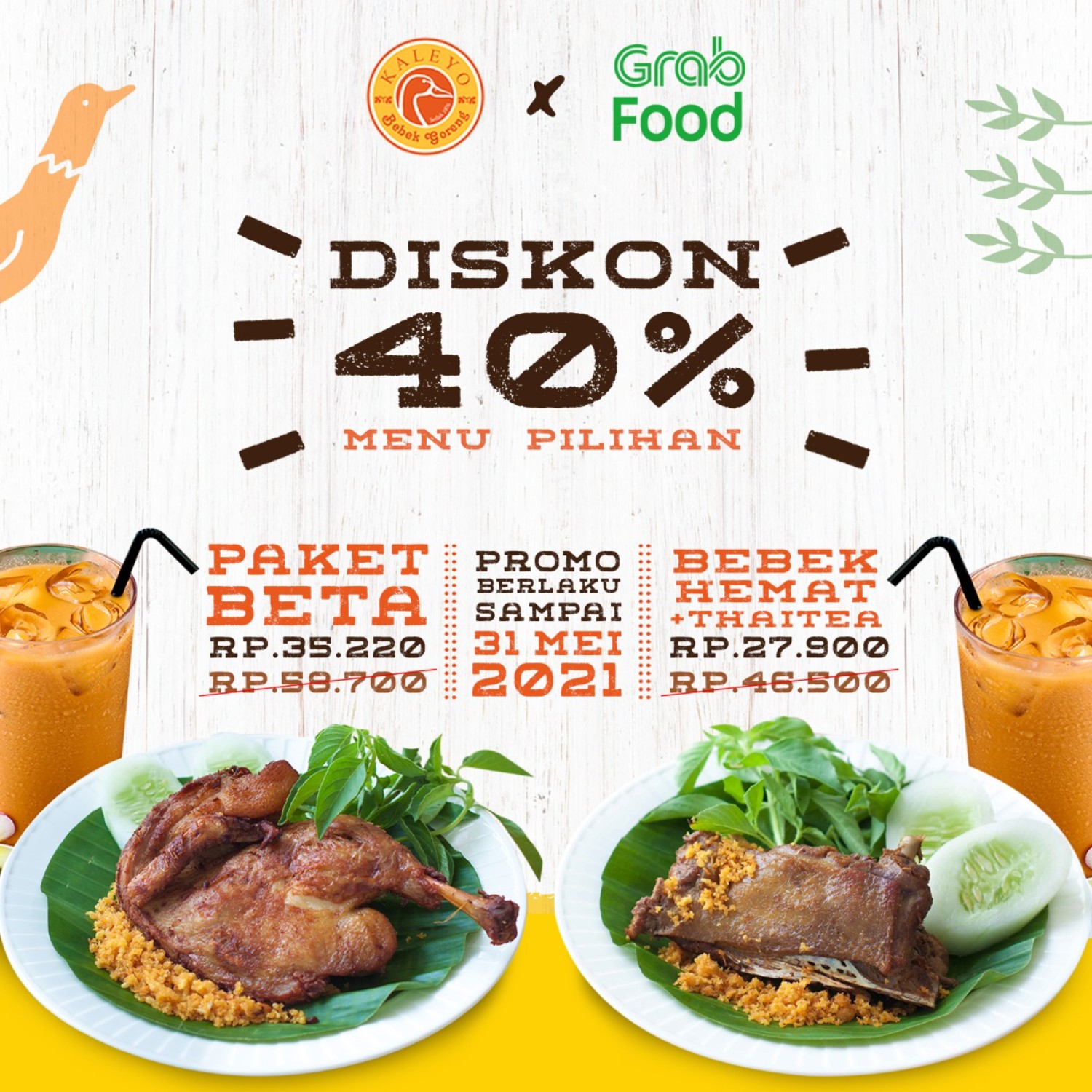 Kaleyo lovers, mimin kasih tau promo penting bulan ini. Bebek Kaleyo bersama dengan Grabfood bagi " promo diskon sd 40% selama bulan mei 2021. Diskon sd 40% untuk menu pilihan Paket BETA ( Bebek Muda + Thai Tea) dan Bebek Hemat + Thai Tea, syarat dan ketentuan berlaku : - promo diskon sd 40% berlaku untuk menu tertentu. - promo ini berlaku sampai dengan 31 mei 2021. - promo ini berlaku di seluruh outlet Bebek Kaleyo Buruan order sekarang juga, jangan sampai kehabisan yah !