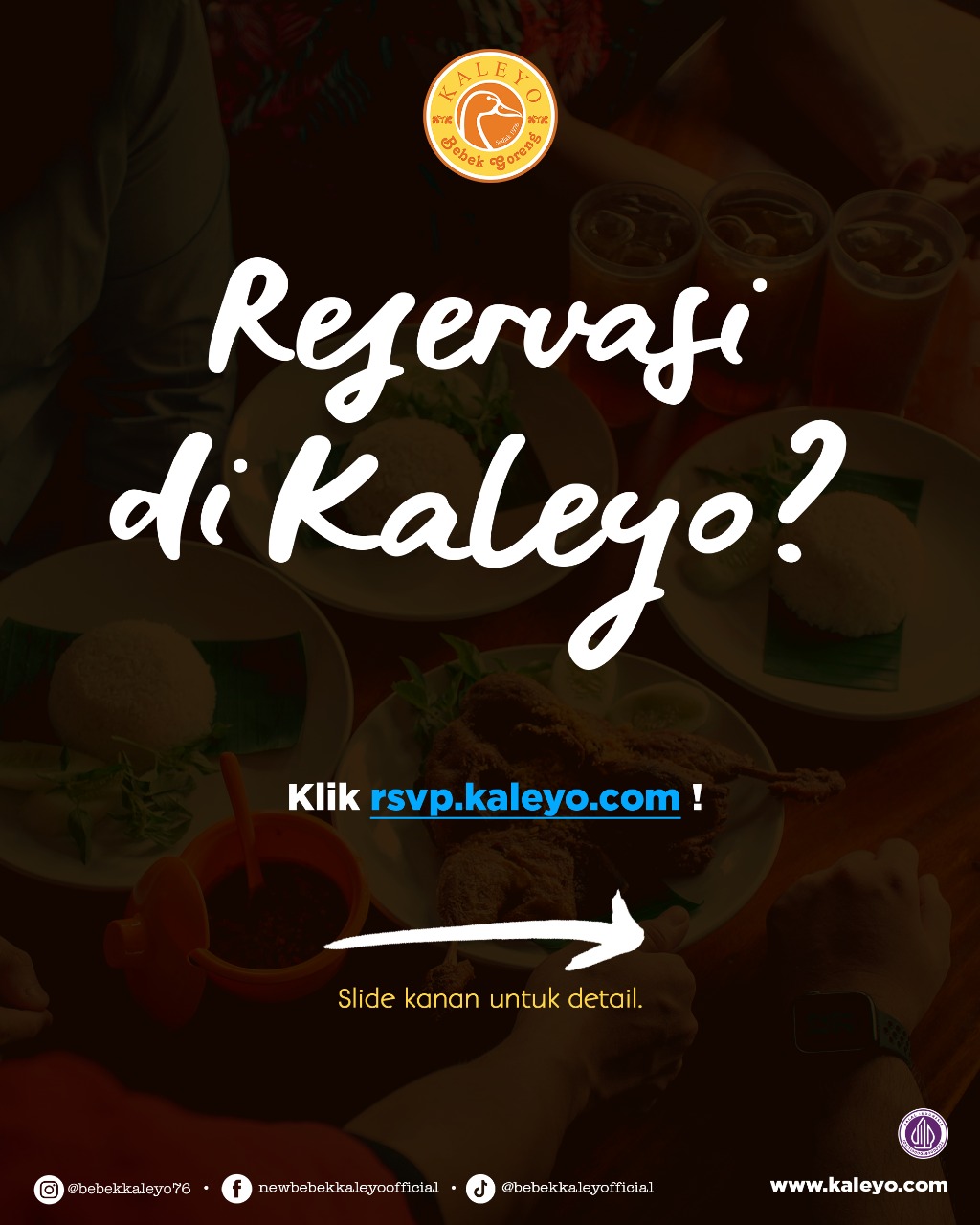 Mau makan bareng keluarga, reuni kecil, atau ada acara spesial di Bebek Kaleyo? Reservasi sekarang gampang banget—cukup buka rsvp.kaleyo.com, pilih cabang dan waktunya, selesai! Lebih praktis, gak perlu antre, dan tempat udah aman buat kamu dan rombongan. Langsung aja klik link-nya dan booking sekarang!