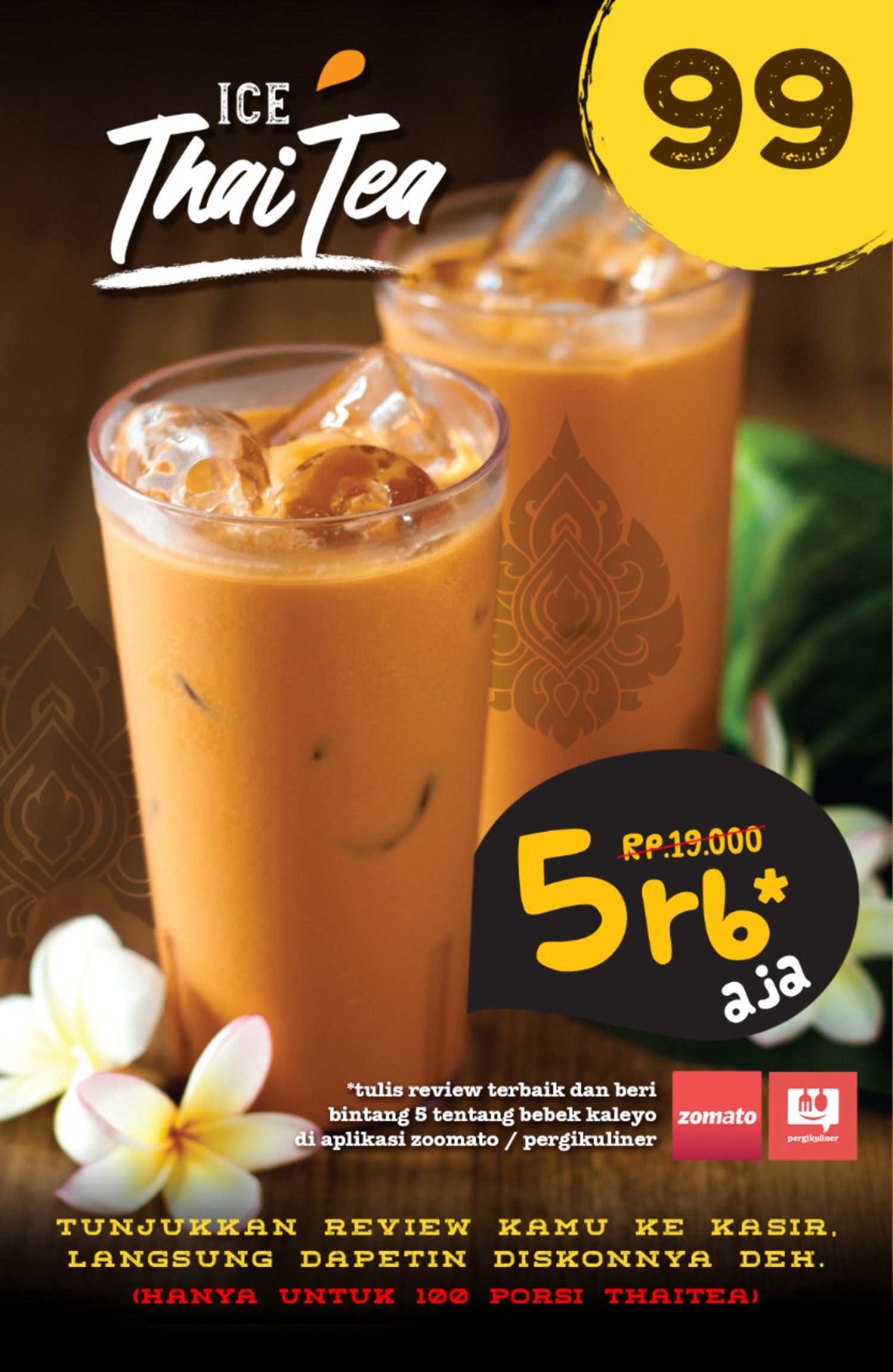 Hey, kaleyo lovers ! Kalau lagi panas gini enaknya di segerin sama yang dingin-dingin nih. Segarnya Es Thai Tea Bebek Kaleyo siap buat nyegerin panasnya hari kamu. . Ada promo menarik nih untuk kamu. Cukup tulis review Bebek Kaleyo di zomato atau pergikuliner Kamu bisa nikmatin thai tea dari harga 19ribu jadi cuma 5ribuan aja lho ! . Caranya gampang banget, setelah kamu review di aplikasi zomato dan pergikuliner, cukup tunjukkan ke kasir kami, dapetin deh potongan harga nya. Promo ini berlaku di outlet Harapan indah, Tomang, Cibubur, PIK, Kemanggisan. . Ayo buruan jangan sampai kehabisan ya !!