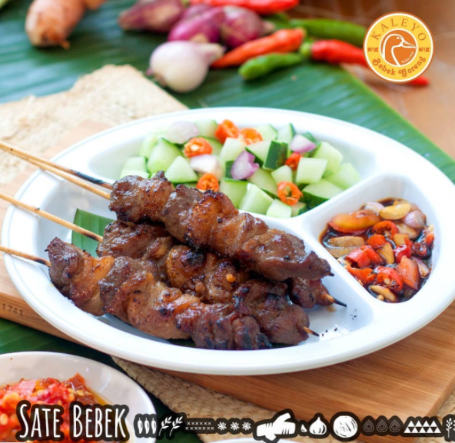 Hahh.. gimana gimana ? makan sate di restoran bebek, Yaps bener banget, nggak cuma bebek goreng, bebek kaleyo juga punya Sate Bebek Lho ! Hmmm.. rasanya sih pastinya enak banget, bayangin aja daging bebek empuk dengan aroma asap sate dan bumbu kecap yang bikin nagih ! Jangan nanya mimin sanggup berapa tusuk, kalian coba sendiri nanti ceritain ke mimin kalian habis berapa tusuk ! Cobain sekarang !